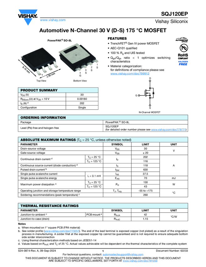 SQJ120EP Automotive N-Channel 30 V (D-S) 175 °C MOSFET