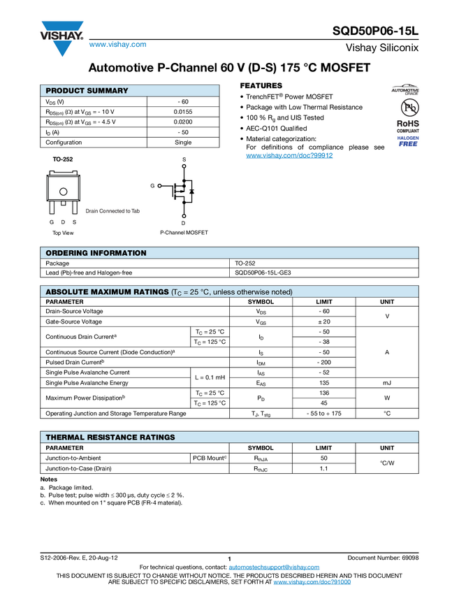 SQD50P06-15L Automotive P-Channel 60 V (D-S) 175 °C MOSFET