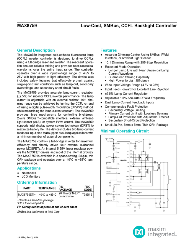 MAX8759 Low-Cost, SMBus, CCFL Backlight Controller