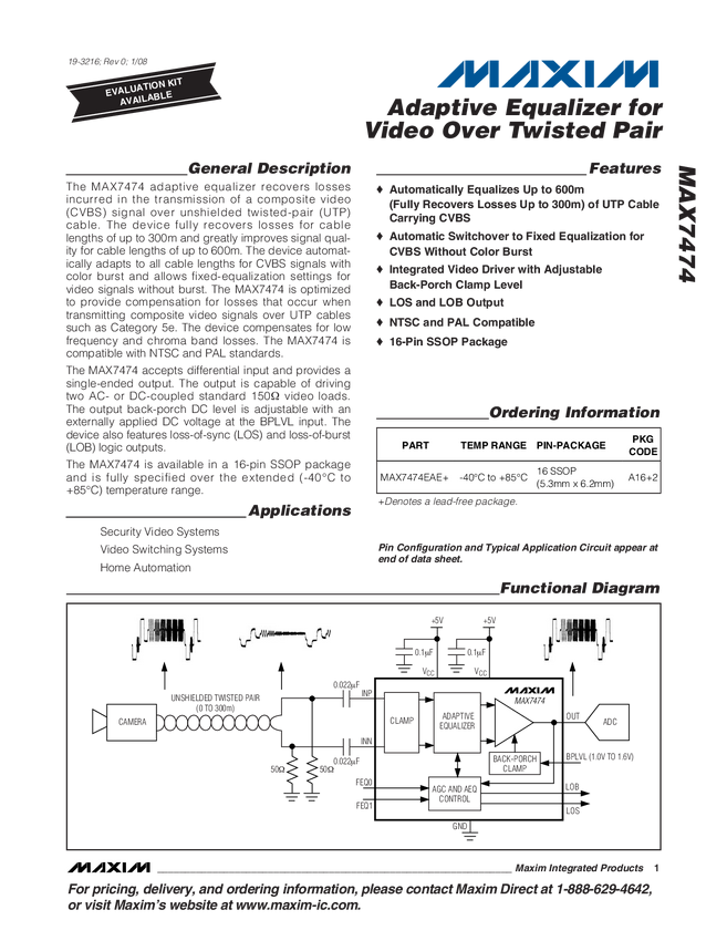 MAX7474 Adaptive Equalizer for Video Over Twisted Pair
