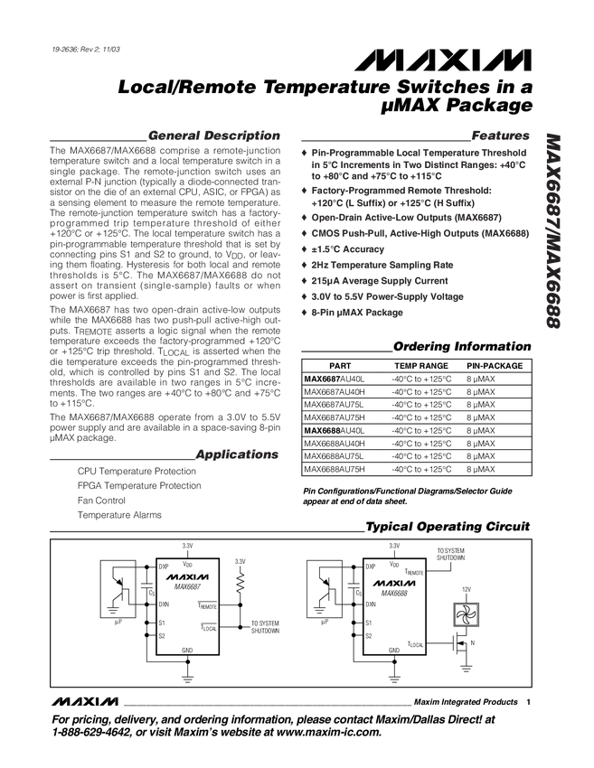 MAX6687 Local/Remote Temperature Switches in a µMAX Package
