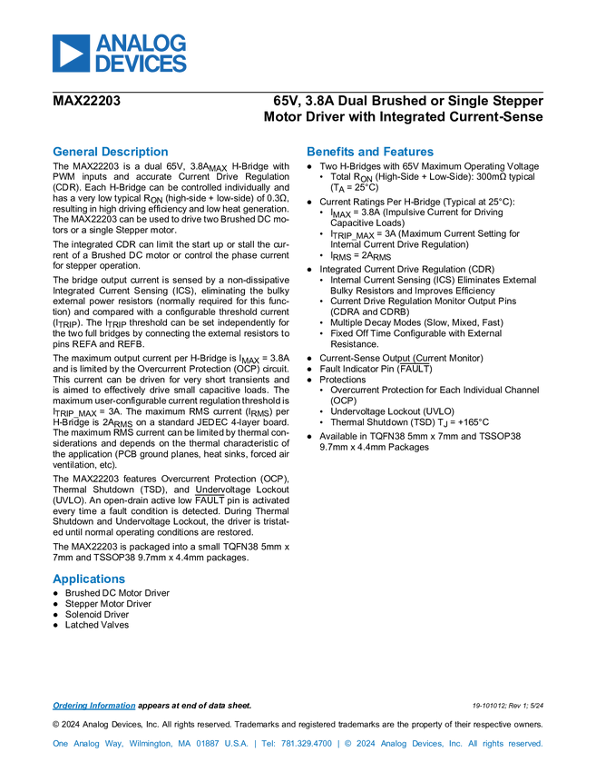MAX22203 65V, 3.8A Dual Brushed or Single Stepper Motor Driver with Integrated Curre...