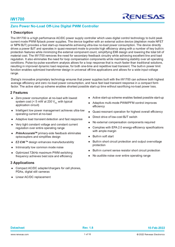 iW1700 PrimAccurate™ Zero No-Load Power Off-Line Digital PWM Controller in a SOT-2...