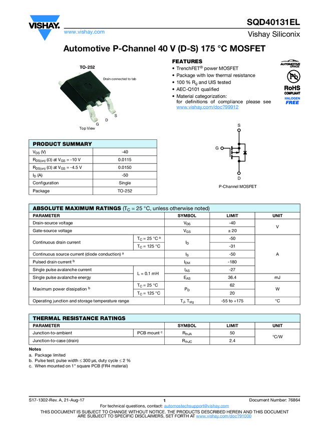 SQD40131EL Automotive P-Channel 40 V (D-S) 175 °C MOSFET