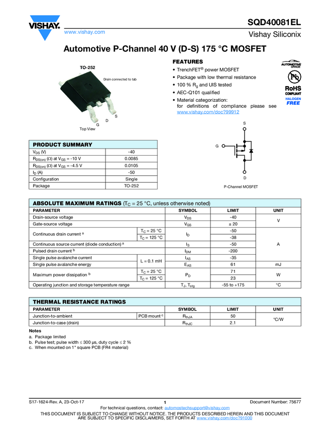 SQD40081EL Automotive P-Channel 40 V (D-S) 175 °C MOSFET