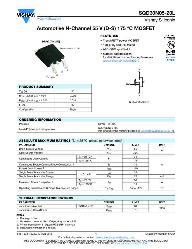SQD30N05-20L Automotive N-Channel 55 V (D-S) 175 °C MOSFET