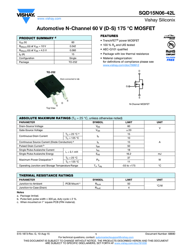 SQD15N06-42L Automotive N-Channel 60 V (D-S) 175 °C MOSFET