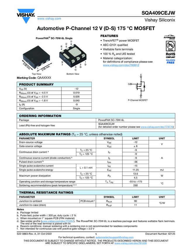 SQA409CEJW Automotive P-Channel 12 V (D-S) 175 °C MOSFET