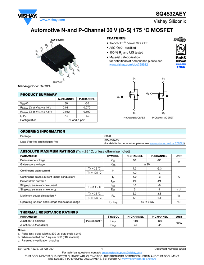SQ4532AEY Automotive N-and P-Channel 30 V (D-S) 175 °C MOSFET