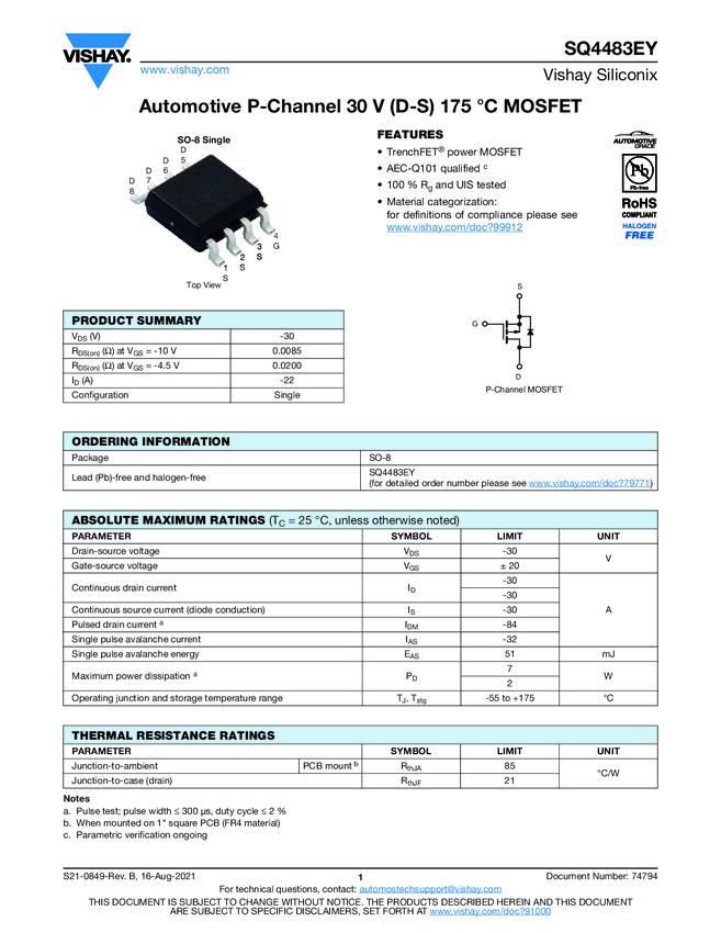 SQ4483EY Automotive P-Channel 30 V (D-S) 175 °C MOSFET