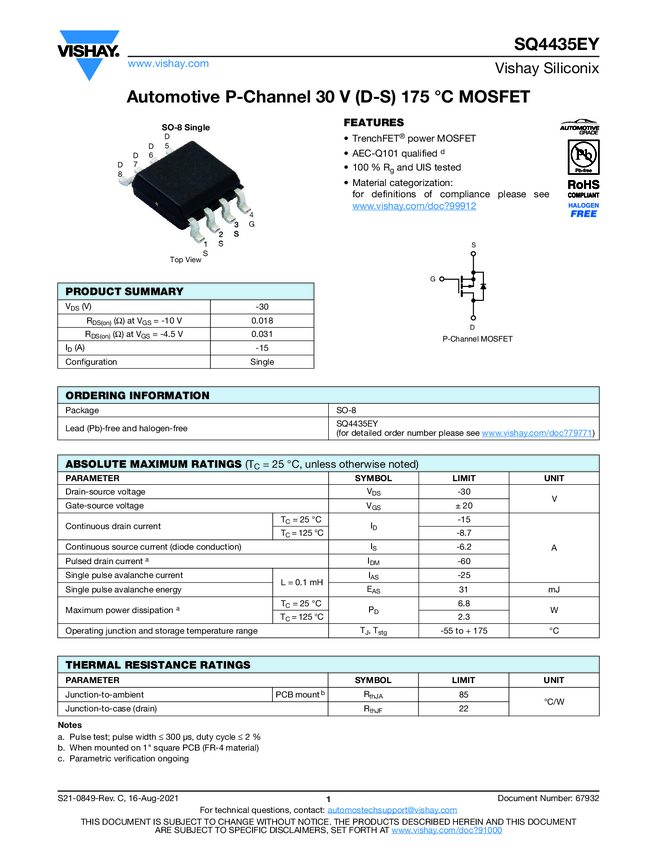 SQ4435EY Automotive P-Channel 30 V (D-S) 175 °C MOSFET
