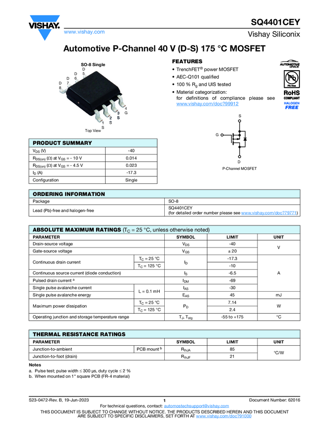 SQ4401CEY Automotive P-Channel 40 V (D-S) 175 °C MOSFET