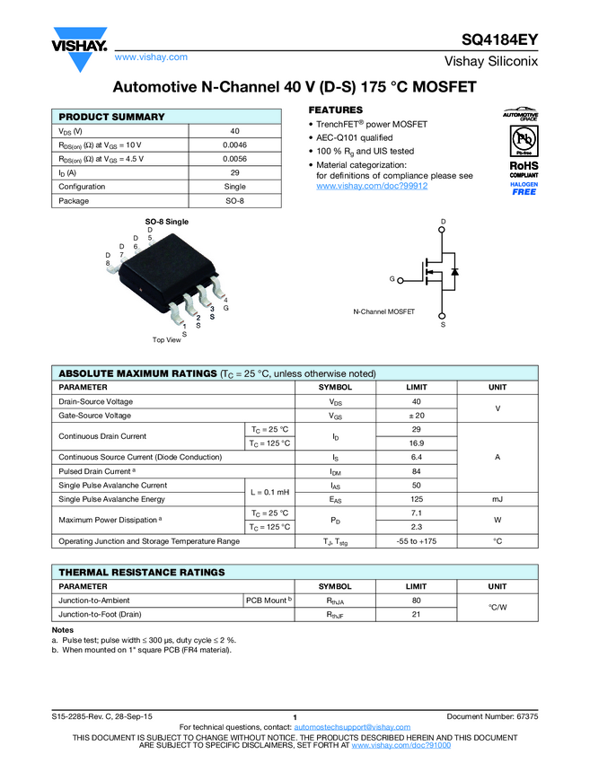 SQ4184EY Automotive N-Channel 40 V (D-S) 175 °C MOSFET