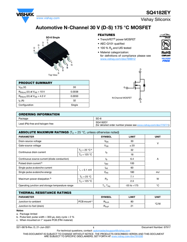 SQ4182EY Automotive N-Channel 30 V (D-S) 175 °C MOSFET