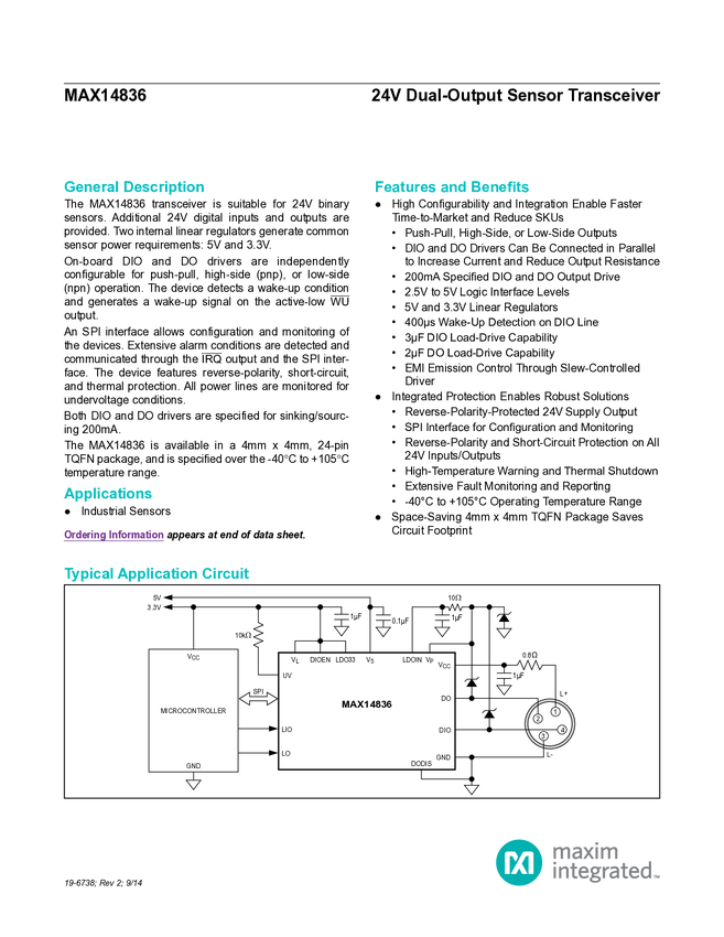 MAX14836 24V Dual-Output Sensor Transceiver