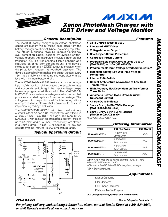 MAX8685C Xenon Photoflash Charger with IGBT Driver and Voltage Monitor