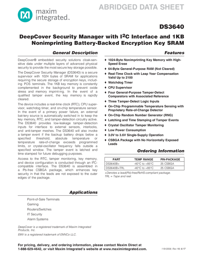 DS3640 DeepCover Security Manager with I²C Interface and 1KB Nonimprinting Battery...