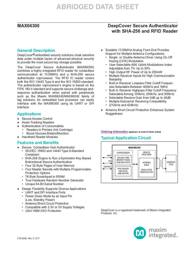 MAX66300 DeepCover Secure Authenticator with SHA-256 and RFID Reader