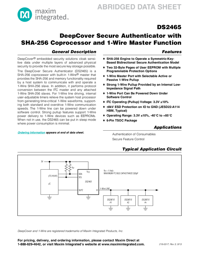 DS2465 DeepCover Secure Authenticator with SHA-256 Coprocessor and 1-Wire Master F...