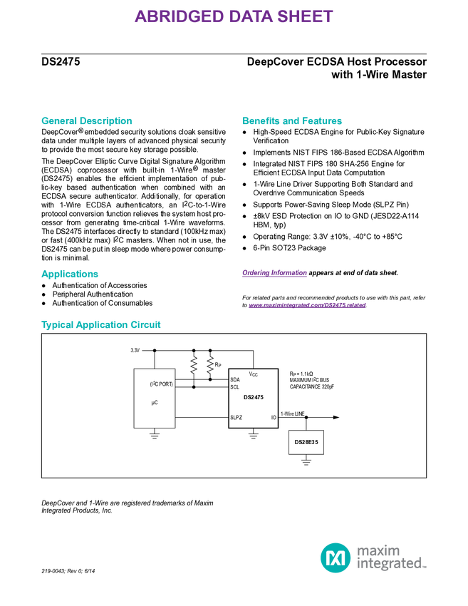 DS2475 DeepCover ECDSA Coprocessor with 1-Wire Master