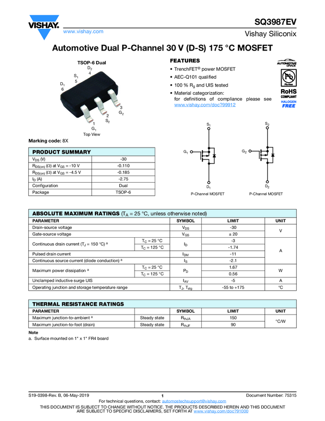 SQ3987EV Automotive Dual P-Channel 30 V (D-S) 175 °C MOSFET