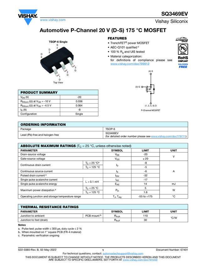 SQ3469EV Automotive P-Channel 20 V (D-S) 175 °C MOSFET