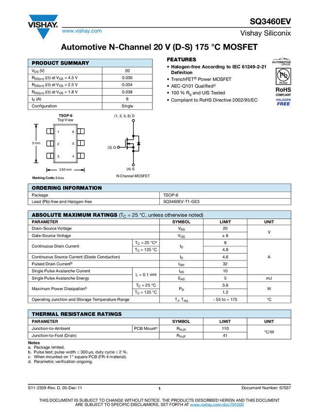 SQ3460EV Automotive N-Channel 20 V (D-S) 175 °C MOSFET