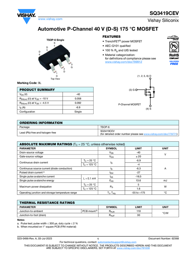 SQ3419CEV Automotive P-Channel 40 V (D-S) 175 °C MOSFET