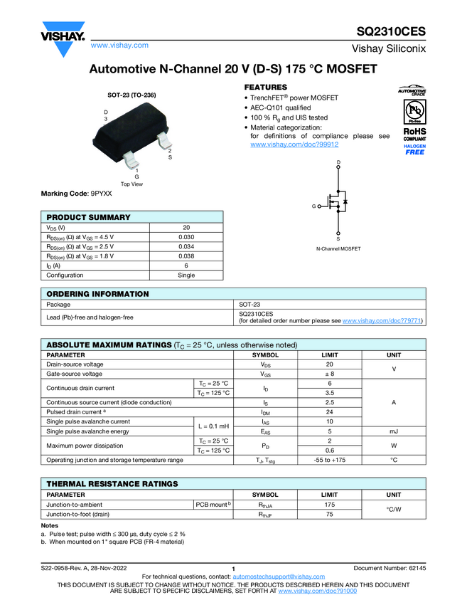 SQ2310CES Automotive N-Channel 20 V (D-S) 175 °C MOSFET