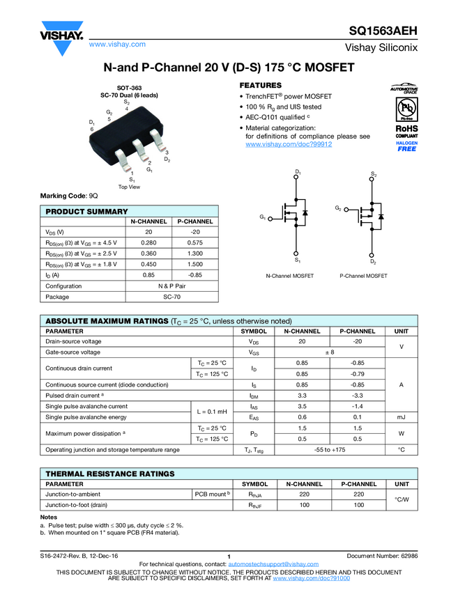 SQ1563AEH N-and P-Channel 20 V (D-S) 175 °C MOSFET