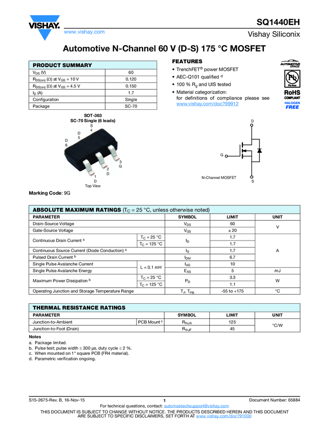 SQ1440EH Automotive N-Channel 60 V (D-S) 175 °C MOSFET