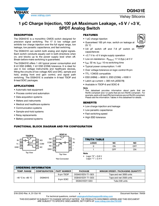 DG9431E 1 pC Charge Injection, 100 pA Maximum Leakage, +5 V / +3 V, SPDT Analog Swi...
