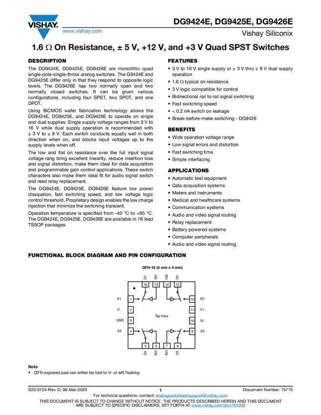 DG9426E 1.6 mΩ On Resistance, ± 5 V, +12 V, and +3 V Quad SPST Switches