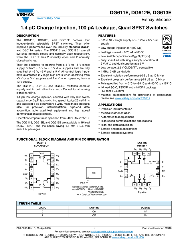 DG611E 1.4 pC Charge Injection, 100 pA Leakage, Quad SPST Switches