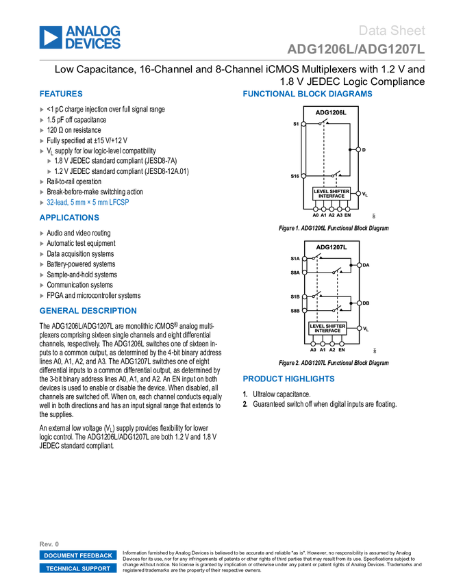ADG1206L Low Capacitance, 8-Channel iCMOS Multiplexer with 1.2 V and 1.8 V JEDEC Log...