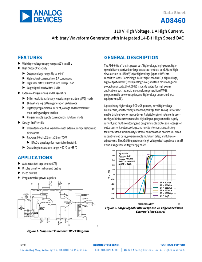 AD8460 110 V High Voltage, 1 A High Current, Arbitrary Waveform Generator with Int...