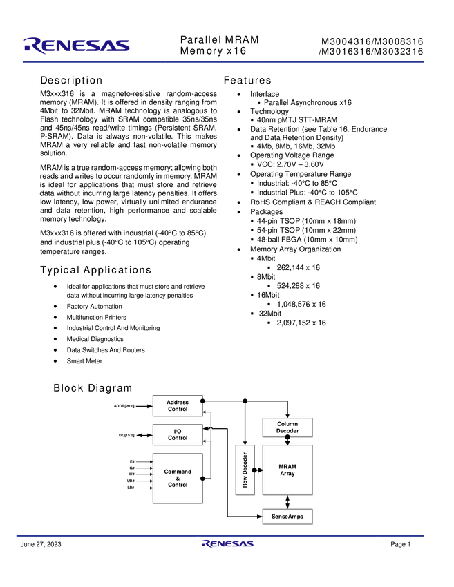 M3032316 Non-Volatile 32Mb MRAM, Parallel Interface, 35ns and 45ns