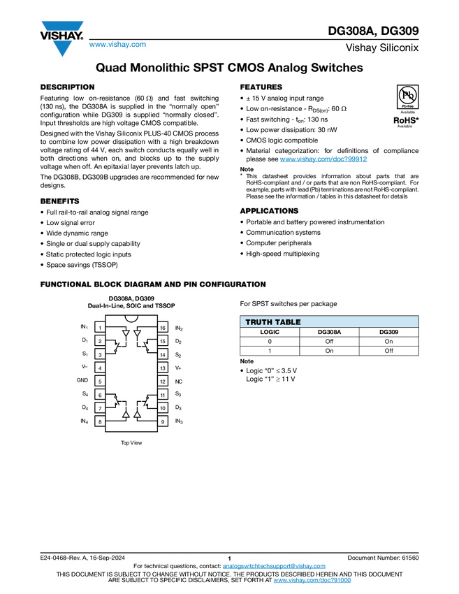DG309 Quad Monolithic SPST CMOS Analog Switches