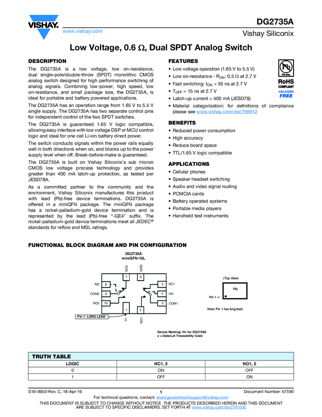DG2735A Low Voltage, 0.6 Ω, Dual SPDT Analog Switch