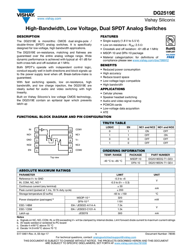 DG2519E High-Bandwidth, Low Voltage, Dual SPDT Analog Switches