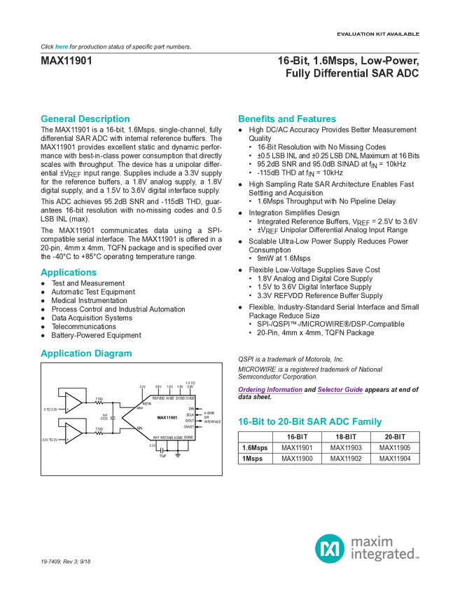 MAX11901 16-Bit, 1.6Msps, Low-Power, Fully Differential SAR ADC