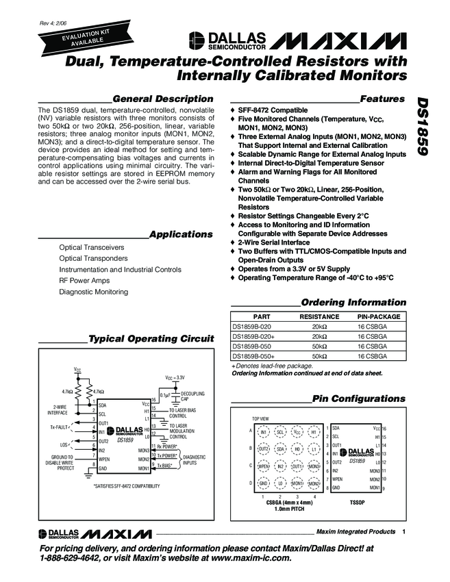 DS1859 Dual, Temperature-Controlled Resistors with Internally Calibrated Monitors