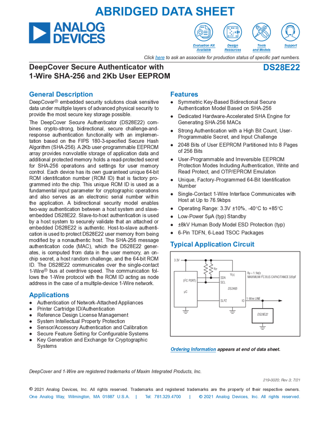 DS28E22 DeepCover Secure Authenticator with 1-Wire SHA-256 and 2Kb User EEPROM