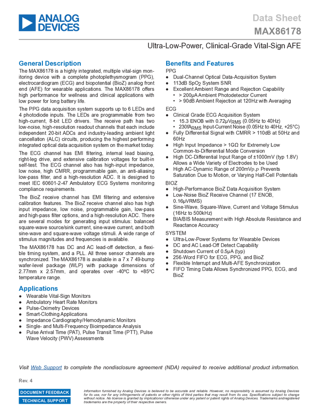 MAX86178 Ultra-Low-Power, Clinical-Grade Vital-Sign AFE