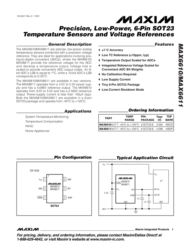 MAX6611 Precision, Low-Power, 6-Pin SOT23 Temperature Sensors and Voltage Reference...
