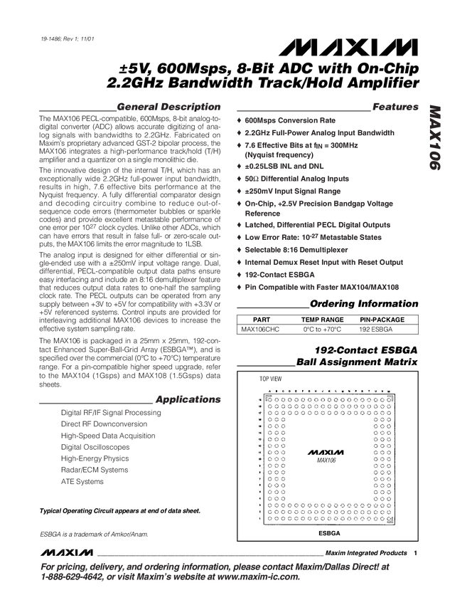 MAX106 ±5V, 600Msps, 8-Bit ADC with On-Chip 2.2GHz Bandwidth Track/Hold Amplifier