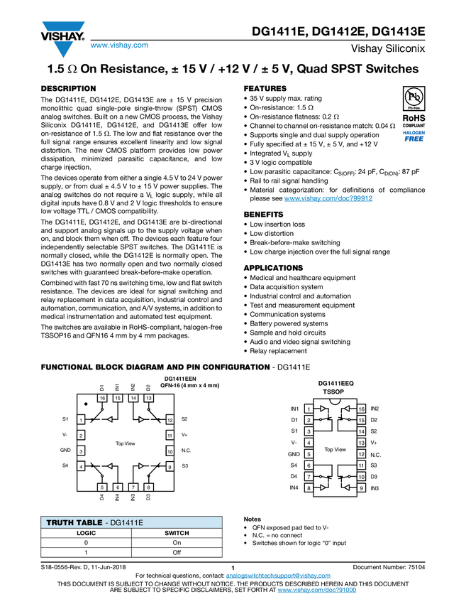 DG1413E 1.5 Ω On Resistance, ± 15 V / +12 V / ± 5 V, Quad SPST Switc...