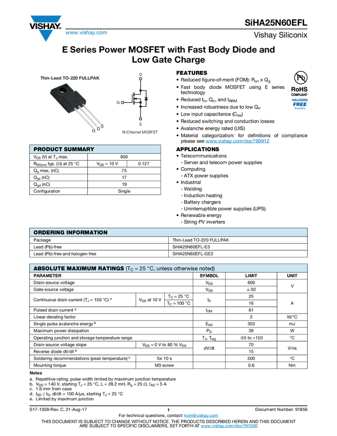 SiHA25N60EFL E Series Power MOSFET with Fast Body Diode and Low Gate Charge