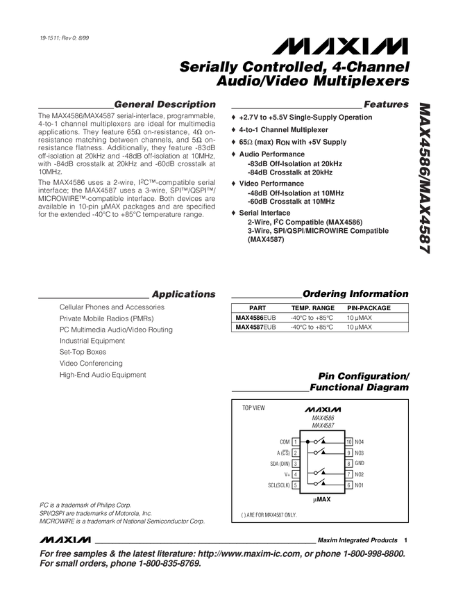 MAX4586 Serially Controlled, 4-Channel Audio/Video Multiplexers