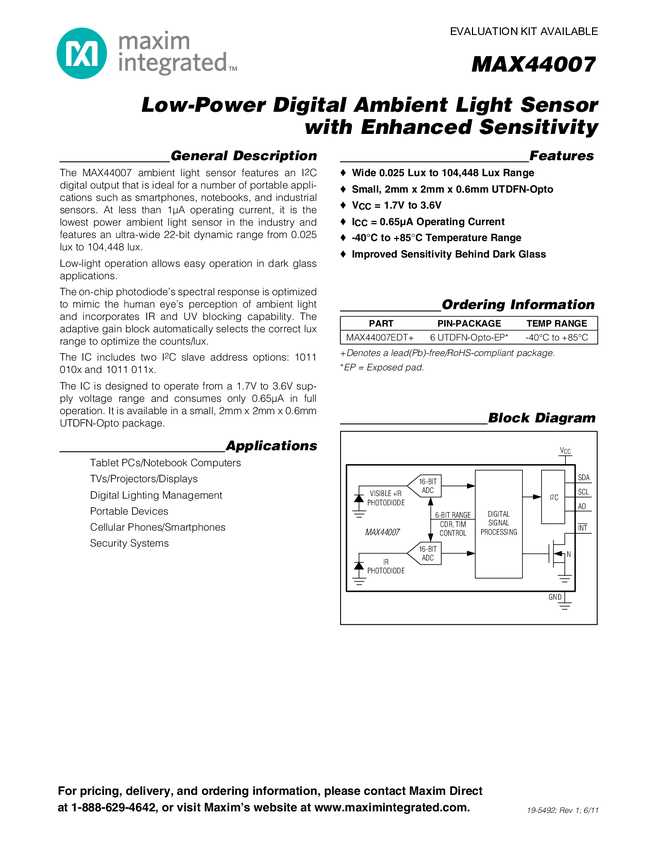 MAX44007 Low-Power Digital Ambient Light Sensor with Enhanced Sensitivity